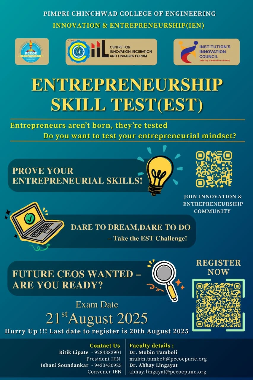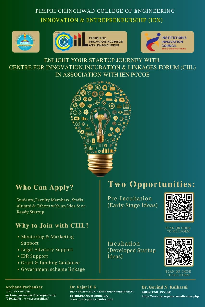 Pimpri Chinchwad College of Engineering (PCCOE) actively promotes innovation, entrepreneurship, and start-up initiatives to equip students with entrepreneurial skills and opportunities. Through various initiatives, facilities, and support systems such as the Innovation and Entrepreneurship (IEN), Institution’s Innovation Council (IIC),SPPU Satrt-up and Innovation Cell (SIC) and CIIL (Centre for Innovation, Incubation and Linkages Forum)), PCCOE has established a robust ecosystem to encourage innovation and entrepreneurship.