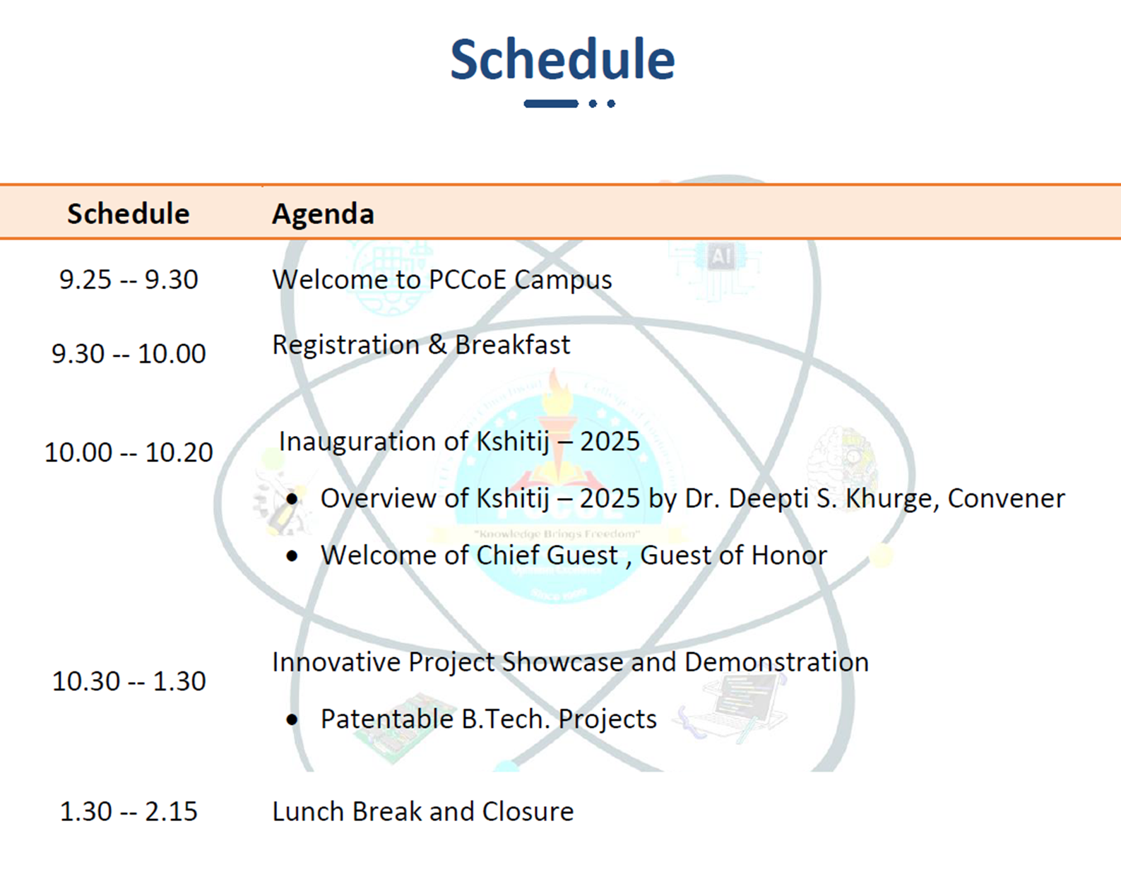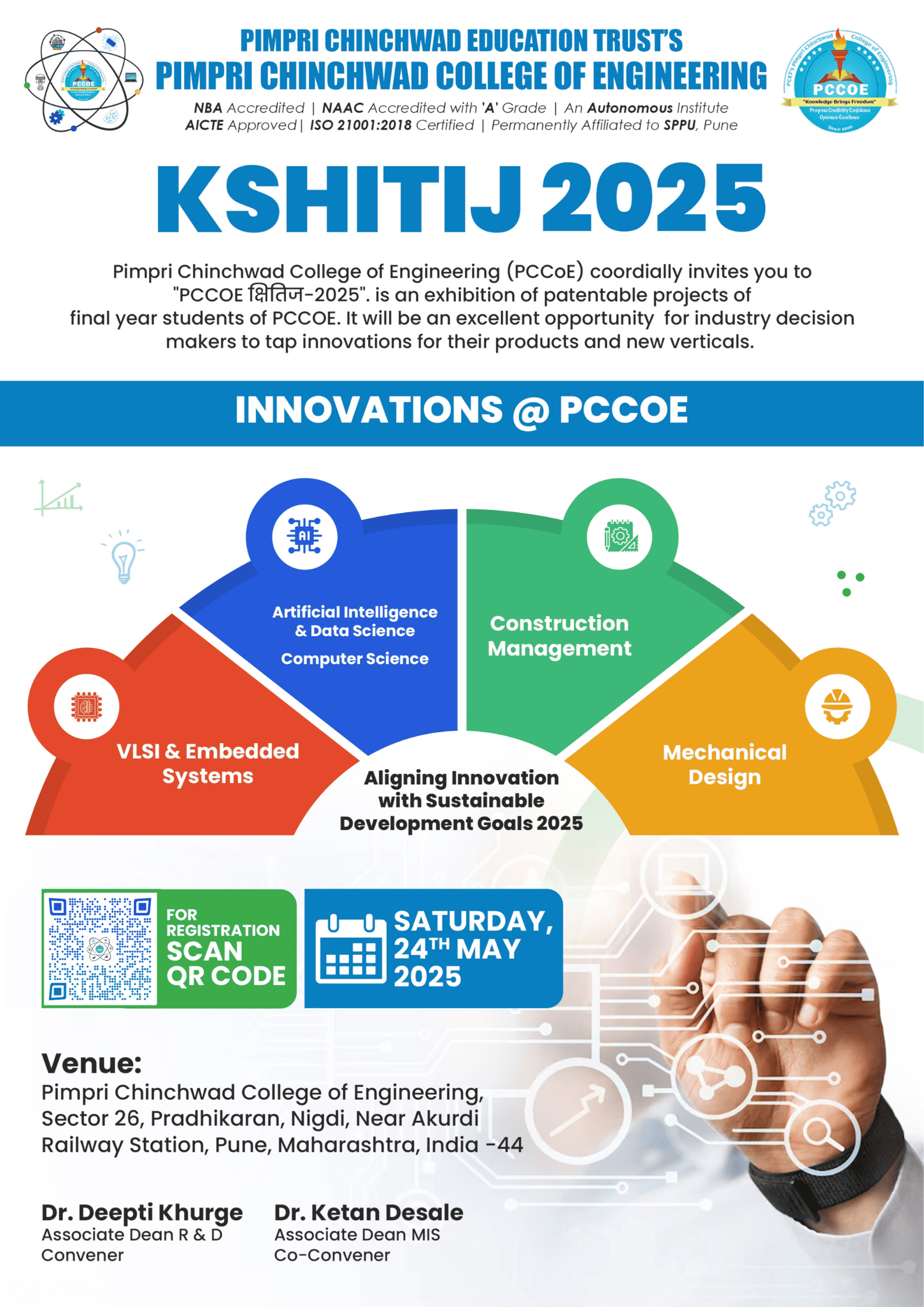 KSHITIJ (क्षितिज) - 2025: Projects showcase conference will be held in PCCoE, Pune on 24th May 2025. It is an august gathering of hundreds of thoughtful delegates from across the industry, to see the talent of the PCCoE students, who share a common interest in practical solutions through global innovation.
